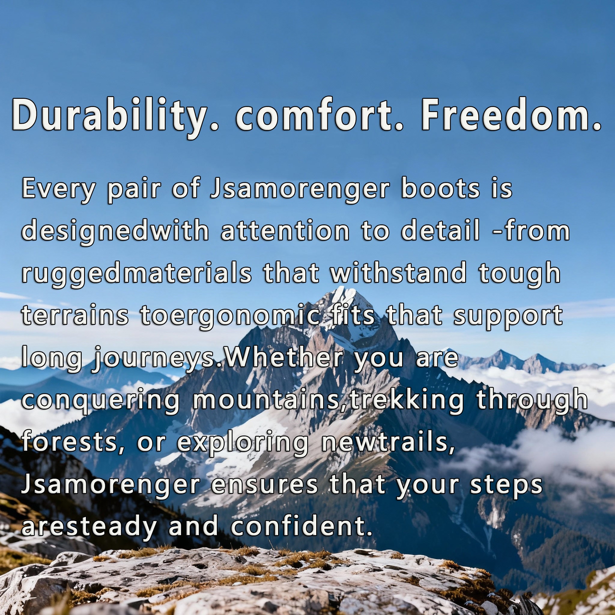 Jsamorenger was born from a relentless pursuit of professional outdoor exploration and a profound respect for the highest standards of footwear craftsmanship. From its inception, the brand has adhered to the philosophy of "making every step trustworthy," dedicated to creating truly high-performance, professional-grade hiking boots for outdoor enthusiasts worldwide. Collaborating with a team of professional British footwear designers, leveraging the traditions of high-end European footwear design, the brand integrates ergonomics, structural mechanics, and outdoor environmental science. With a unique design language and rigorous technical standards, it redefines the comfort, durability, and protection of hiking boots. From materials to structure, from last development to multi-terrain outsoles, every Jsamorenger product undergoes multiple rounds of professional testing and real-world validation across various terrains to ensure stability and reliability in complex environments such as mountains, forests, rocky terrain, and rain/snow. We believe that a good hiking boot is not just equipment, but the most loyal support for exploring the unknown and pushing limits. Therefore, Jsamorenger insists on high-end materials, in-depth research and development, and meticulous manufacturing, all to create professional outdoor gear that accompanies users further, more stably, and more safely. In the future, we will continue to be driven by British design aesthetics and technological innovation, providing global outdoor explorers with high-end products that they can trust in the long term, making every step a starting point for changing the world.